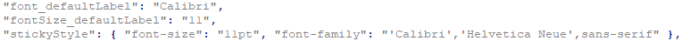 For changing the default font and font size it is really simple and minimal change. Please do note, that you need to change the attributes “font_defaultLabel” and “fontSize_defaultLabel” for changing the label, and apply the change also for the “stickyStyle” -attribute, which will set the actual default font and font size. Change all the forementioned values to get the desired outcome. I’m using Calibri with font size 11 as reference, to match it with my Outlook settings 🙂