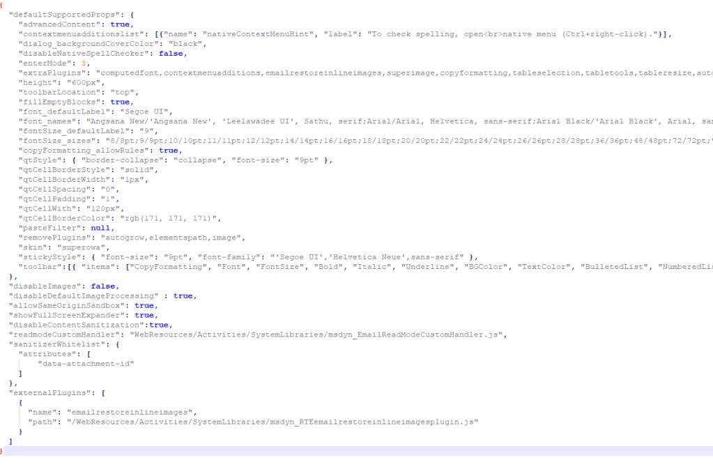 Here the properties we want to focus into is under the defaultSupportedProps -section. So what exactly is defaultSupportProps? In a nutshell, defaultSupportedProps is basically a set of properties for the plug-ins, and includes support for all the CKEditor configurations, which you can also extend with your own properties for more plug-ins you might be adding or creating later. All CKEditor-supported properties are placed under defaultSupportedProps.