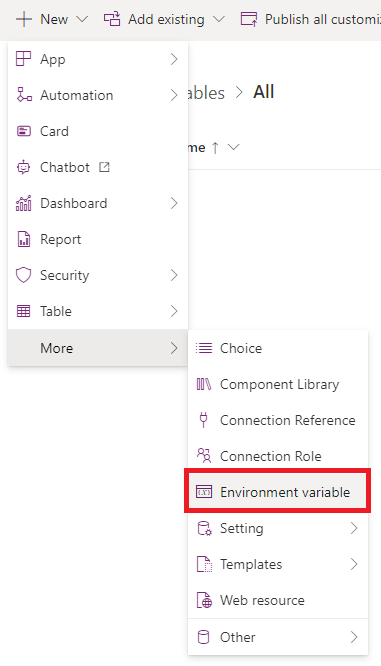 Start either by selecting existing solution, or create a new solution to add your new variable into. I created new solution just for environment variables, which I also consider to be a good practice and part of a good solution strategy.