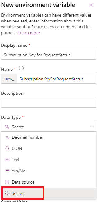 From the configuration pane, give a describing name for your new variable, and select Secret as your Data Type.