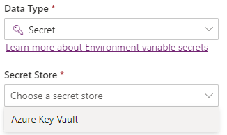 This selection will open more configuration options. You need to define Secret Store of the variable. Currently only Azure Key Vault is supported.