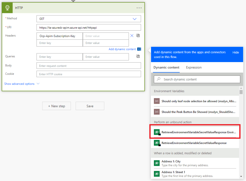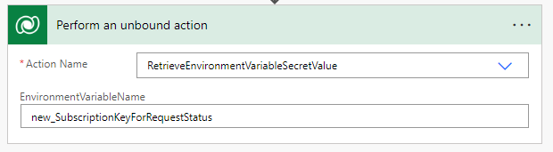 In order to retrieve the secret value from the environment variable, you need to do this with an unbound action. Find the action called RetrieveEnvironmentVariableSecretValue, and then enter the name of the Environment Variable you just created.