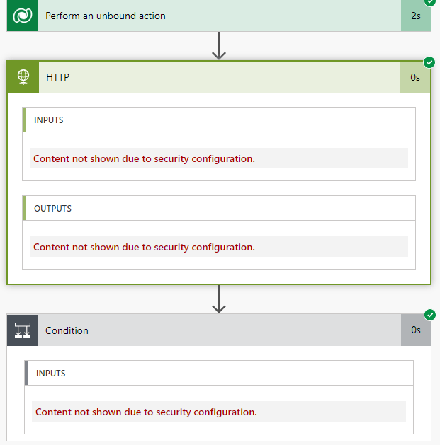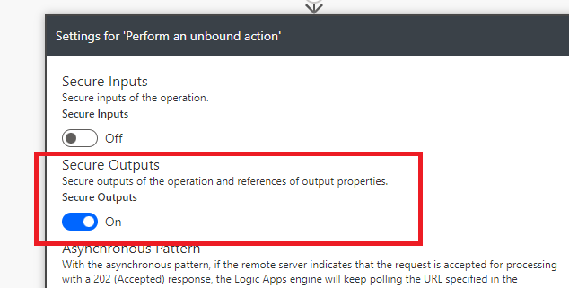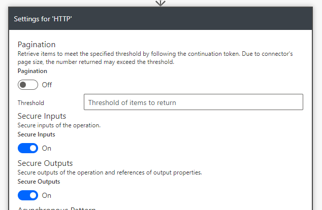 This setting will ensure that the output from this action is secure, and not visible in the logs. It is also important to toggle Secure Inputs and Secure Outputs to be in On -state for the HTTP action, since it is processing this secret value, and might also pass something forward as well. Let’s proceed to configure the HTTP action.
