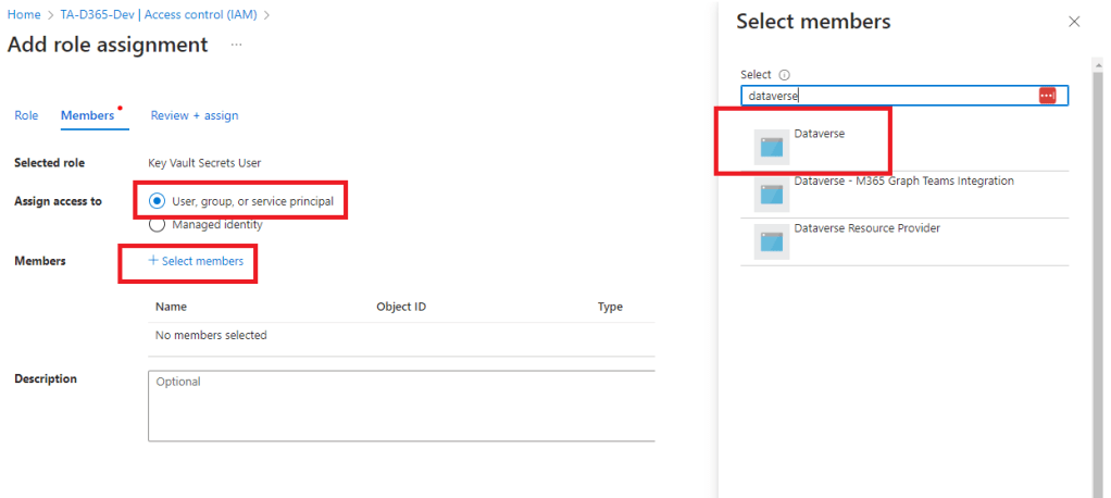 When adding the role assignment, make sure you have the “User, group or service principal” -selected, click on Select Members as you would do when adding e.g. users. Then from the member list, search for Dataverse and finally add the role.