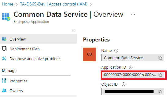Before continuing, double check that you added the correct Datavers service principal as the user. You can check this by clicking the Dataverse on the Role Assignment list, which should open you the Enterprise Application view. Make sure the Application ID is 00000007-0000-0000-c000-000000000000. Note that this Application ID is NOT in relationship with your Power Platform Environments Environment ID in any way. So don’t panic if you don’t see your Environment ID in this view.