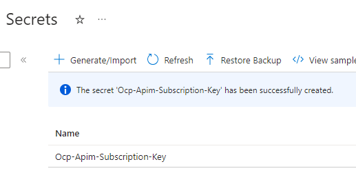 I used the default subscription header name as the name of this secret to easily identify it later. If you created the secret successfully, you will get the prompt for it, and see your new secret by name in the list.