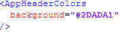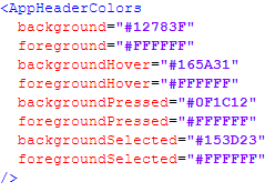 Background– The background color of the app header. This element must be defined for any changes to take effect.Foreground– The text color of the app header. If this isn’t specified, the system attempts to calculate an appropriate color that has sufficient contrast to the provided background color.BackgroundHover– The background color of buttons on the app header when they’re hovered over. If no value is specified, the system calculates a color based on the background color.ForegroundHover– The text color of buttons on the app header when they’re hovered over. If no value is specified, the system attempts to calculate an appropriate color that has sufficient contrast to the backgroundHover color.BackgroundPressed– The background color of buttons on the app header when they’re pressed. The defaulting logic is the same as backgroundHover.ForegroundPressed– The text color of buttons on the app header when they’re pressed. The defaulting logic is the same as foregroundHover.BackgroundSelected– The background color of buttons on the app header when they’re selected. The defaulting logic is the same as backgroundHover.ForegroundSelected– The text color of buttons on the app header when they’re selected. The defaulting logic is the same as backgroundHover.