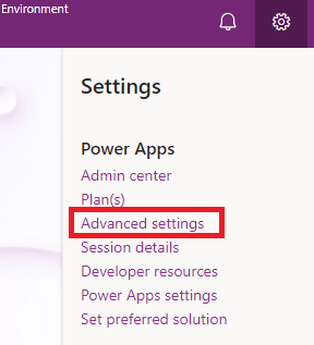Start configuring the logo by going to the advanced settings. You can access advanced settings either from the maker portal, or through the environment itself if you have it opened. Under the gear icon, select “Advanced settings”