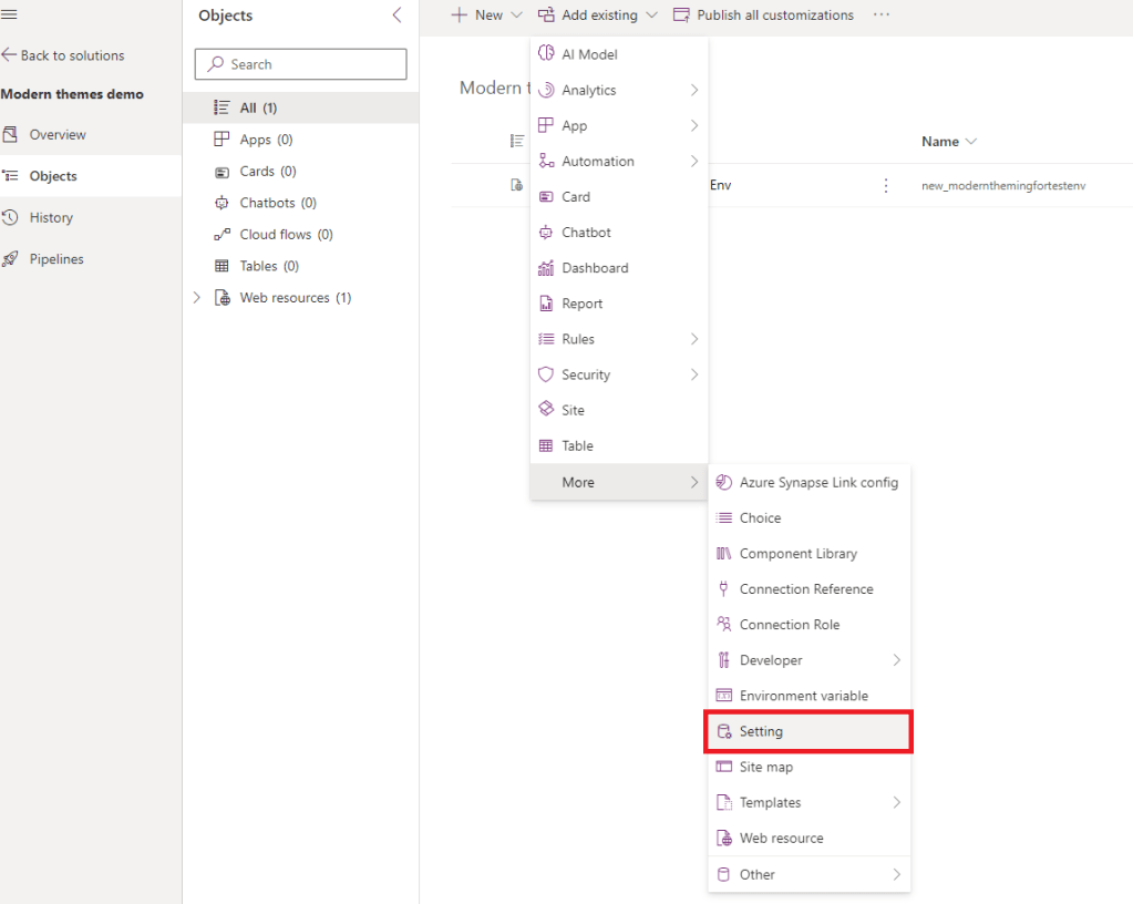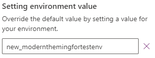 After adding the setting to the solution, open the setting for editing by clicking on it. Add the name of the web resource you previously created, to the environment value -field.