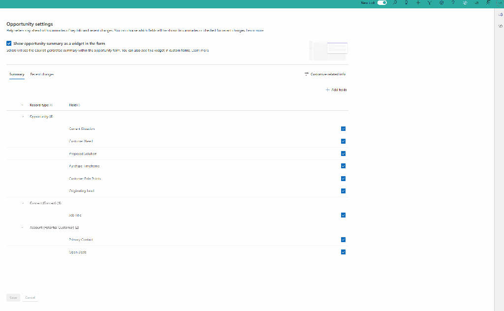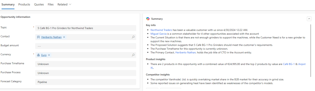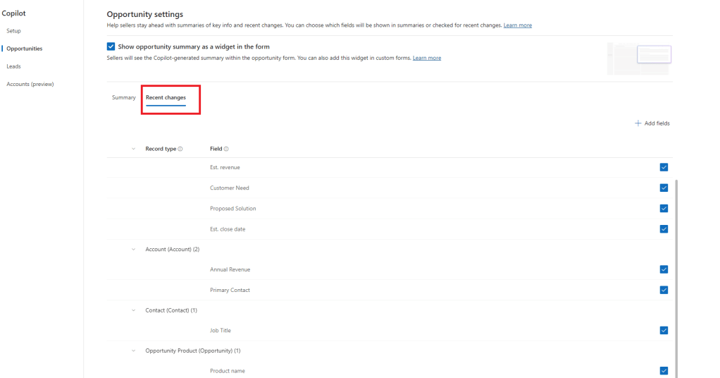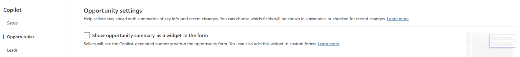 In the Opportunity it’s possible to have an “Opportunity Summary” made by Copilot as a widget in your form. It is not turned on by default, but you can access it under the Opportunity settings inside Copilot settings.