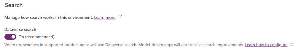 You should also have Dataverse search enabled. This should be the case for most environments, as it has been set to On by default since 2021. But it is worth to check this from environment settings, it can be found under the Features.